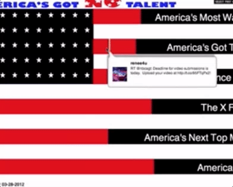 “America’s Got No Talent” was created to highlight the increasing popularity of social media and how reality shows are gaining more notoriety from the Internet than actual viewers.The rankings are displayed in a horizontal bar graph in the shape of an American flag where small rectangles make up the larger “stripes” of the flag and each one represents a “tweet” sent that references one of six reality television shows that crowdsource the American population as their “contestants”.