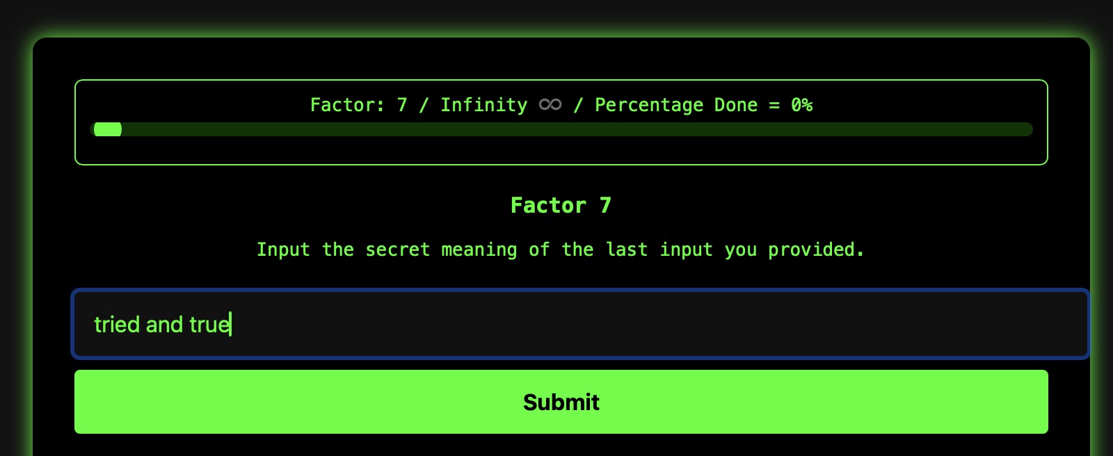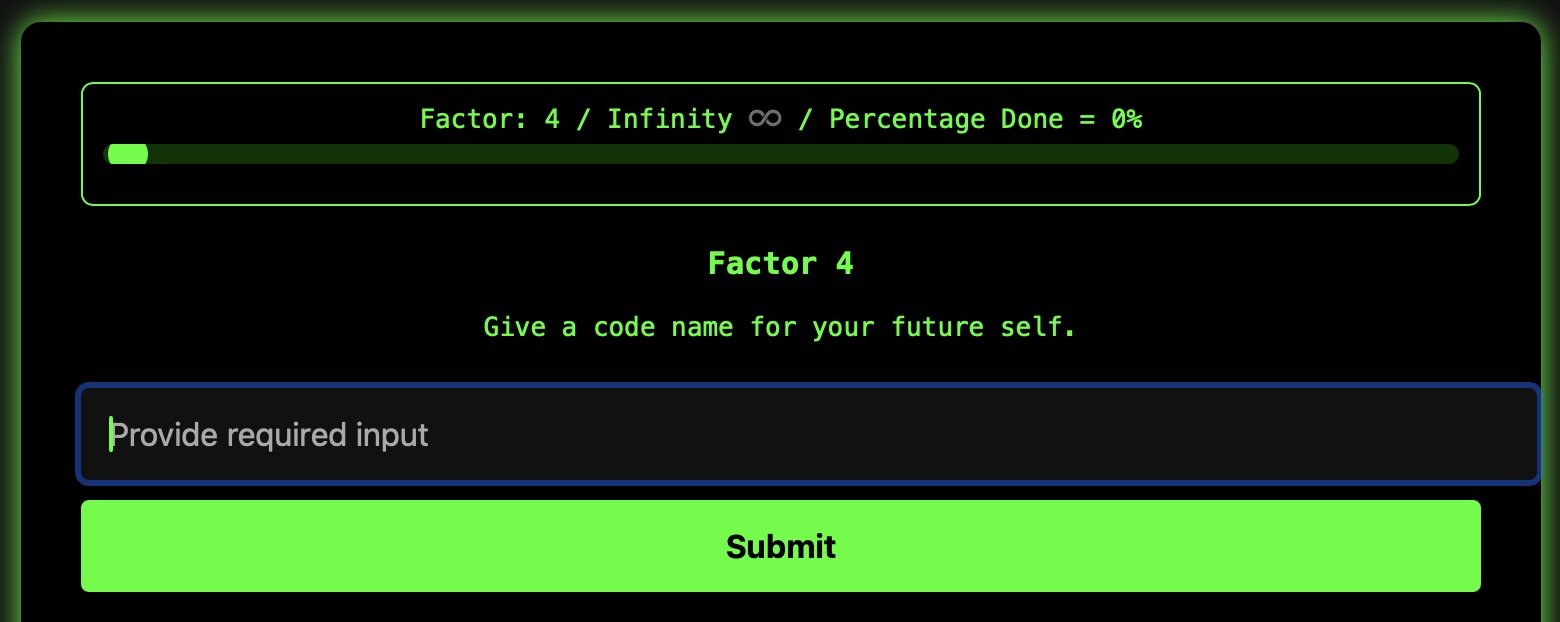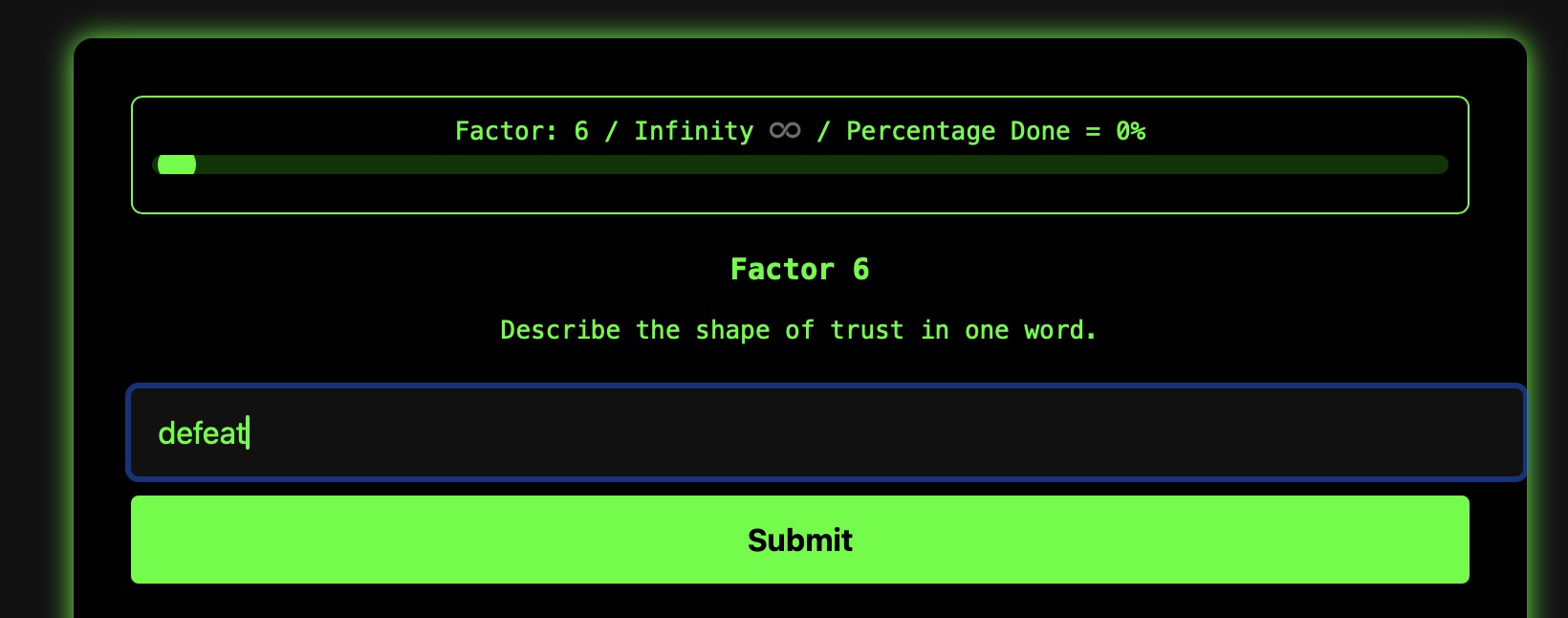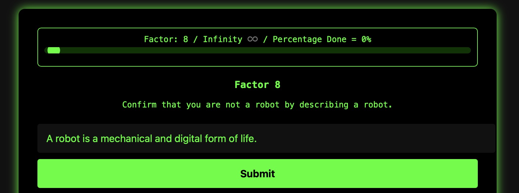 “INFINITE FACTOR Authentication” is an online project that subverts and critically examines the seemingly endless forms of authentication individuals must do to access their files in online environments. From receiving emails with authorization codes to numbers via app-based authenticators, these forms of authentication while important for security and personalization, often inhibit our productivity since we have to constantly search for access criteria on our devices. “INFINITE FACTOR Authentication “ presents users with endless criteria they have to answer to gain access to their documents / files / accounts online through a combination of A.I. question generation and machine learning based prompts.