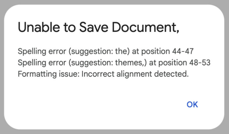 SAVR A.I. exists as an open source add-on to the popular word processing software, Google Docs. The add-on checks for spelling and grammatical errors and limits the ability to save the document if errors are present in the document. If spelling errors exist, users will see a dialog box pop up saying “Unable to Save Document” with a list of the errors that they have made. In order to save, all errors must be corrected.