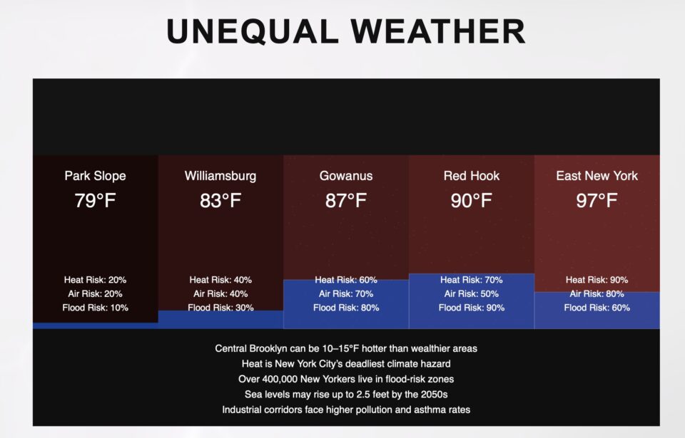 The work draws on publicly available data showing that Central Brooklyn can be up to 10–15°F hotter than wealthier areas, that heat is New York City’s deadliest climate hazard, and that over 400,000 residents live in flood-risk zones. By presenting these conditions simultaneously within a single borough, *Unequal Weather* transforms abstract statistics into a shared, spatial experience, highlighting how environmental risks are unevenly distributed across urban communities.