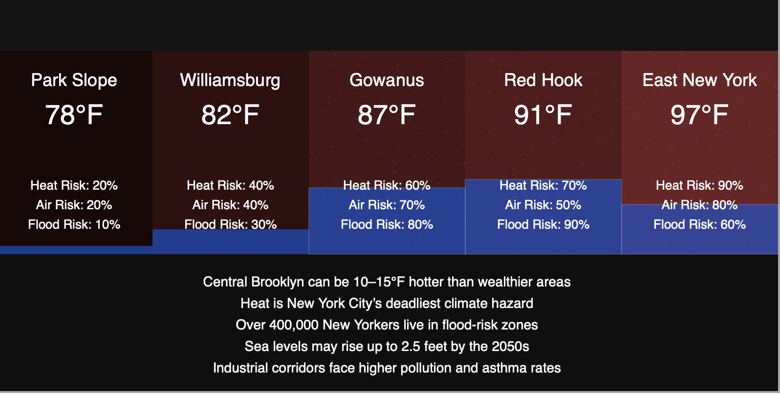 “Unequal Weather”is a digital installation that visualizes environmental inequity across Brooklyn neighborhoods in real time. The screen is divided into multiple districts, each displaying simulated local conditions including temperature, air quality, and flood risk. As environmental vulnerability increases, each panel becomes visually unstable—overheating, filling with water, or degrading with static—making the disparities between neighborhoods immediately visible.