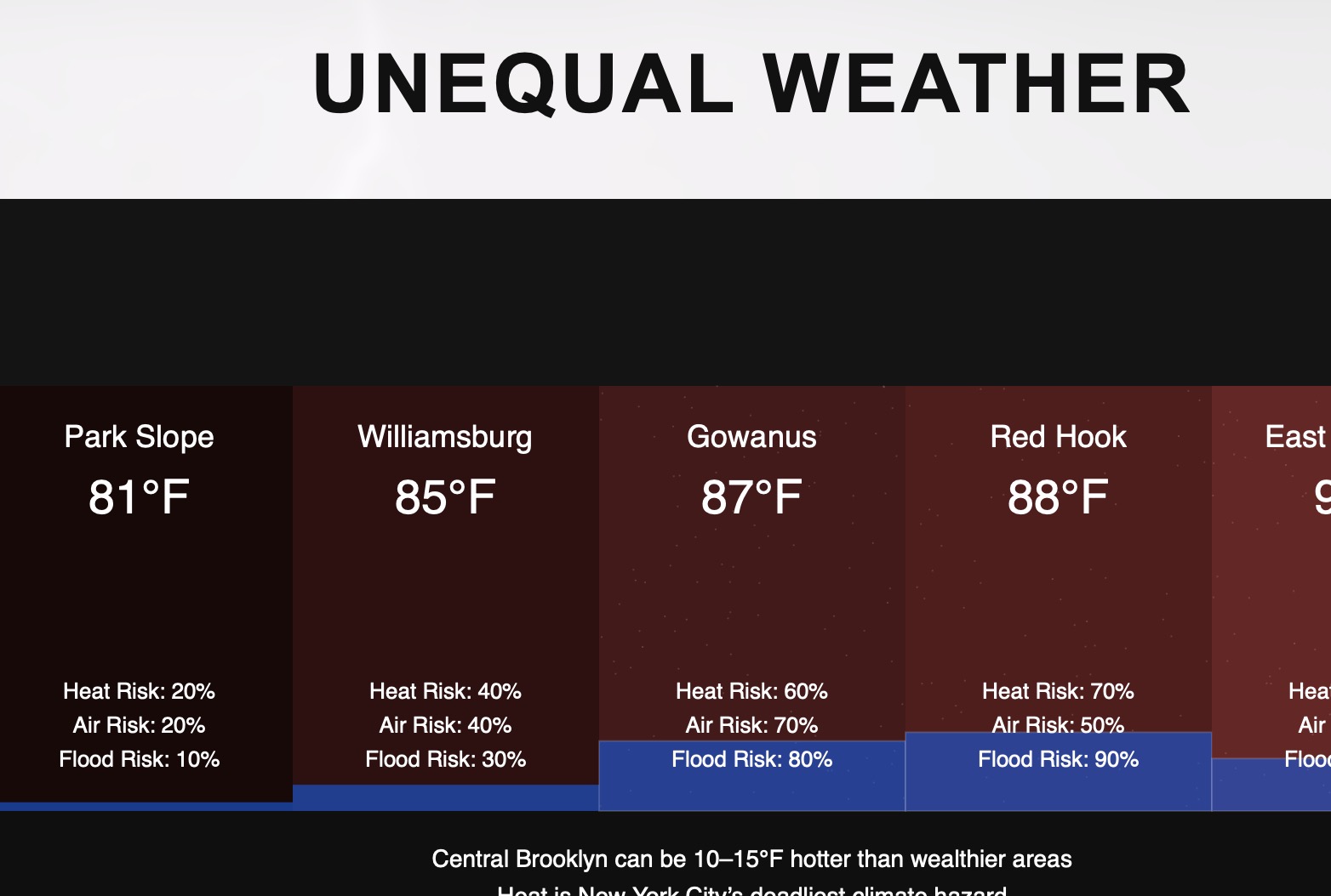 “Unequal Weather”is a digital installation that visualizes environmental inequity across Brooklyn neighborhoods in real time. The screen is divided into multiple districts, each displaying simulated local conditions including temperature, air quality, and flood risk. As environmental vulnerability increases, each panel becomes visually unstable—overheating, filling with water, or degrading with static—making the disparities between neighborhoods immediately visible.